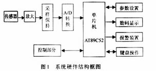 如图1所示,本系统以AT89C52单片机为核心组成一个具备数据采集、对象控制、结果显示、报警装置、键盘操作等多项功能的复杂完整系统。